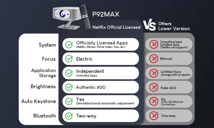 Bring cinema-quality entertainment home with the Salange P92MAX Smart Projector. Powered by Android 13, it supports 1080P native resolution, 4K playback, and Netflix streaming for an immersive viewing experience. With WiFi6, Bluetooth 5.2, electronic focus, and auto keystone correction, setup is effortless, delivering crisp, vibrant visuals and precise alignment every time. Ideal for home cinema, gaming, or movie nights.